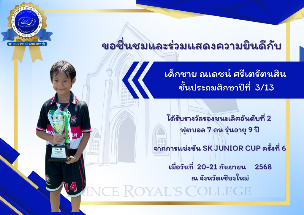 ขอชื่นชมและร่วมแสดงความยินดีกับ เด็กชายณเดชน์ ศรีเตรัตนสิน ชั้นประถมศึกษาปีที่ 3/13 ได้รับรางวัล รองชนะเลิศอันดับที่ 2 ฟุตบอล 7 คน รุ่นอายุ 9 ปี จากรายการที่ไปแข่ง SK JUNIOR CUP ครั้งที่ 6
