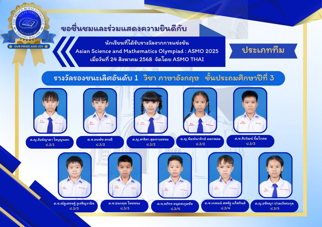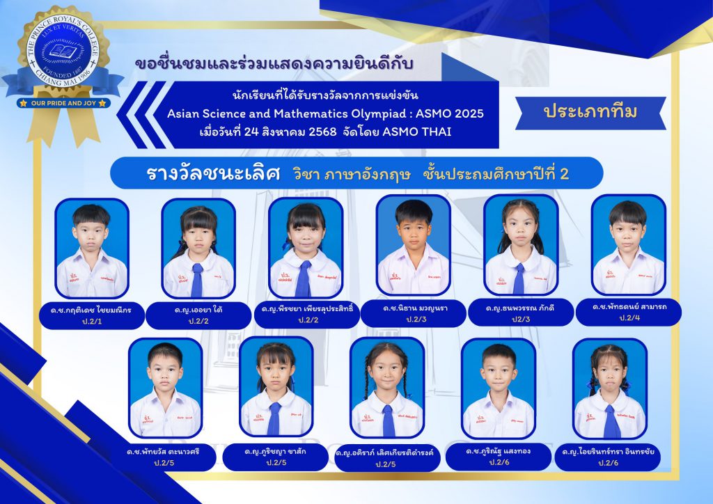 ขอชื่นชมและแสดงความยินดีกับนักเรียนที่ได้รับรางวัลจากการแข่งขัน Asian Science and Mathematics Olympiad : ASMO 2025 รางวัลชนะเลิศประเภททีม วิชาภาษาอังกฤษ ชั้นประถมศึกษาปีที่ 2