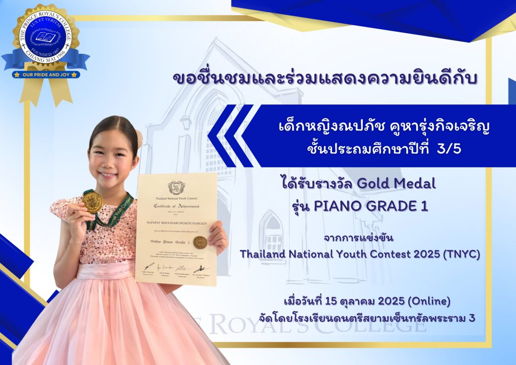 ขอชื่นชมและแสดงความยินดีกับเด็กหญิงณปภัช คูหารุ่งกิจเจริญ ชั้นประถมศึกษาปีที่ 3/5 ได้รับรางวัล Gold Medal รุ่น PIANO GRADE 1 จากการแข่งขันThailand National Youth Contest 2025 (TNYC)