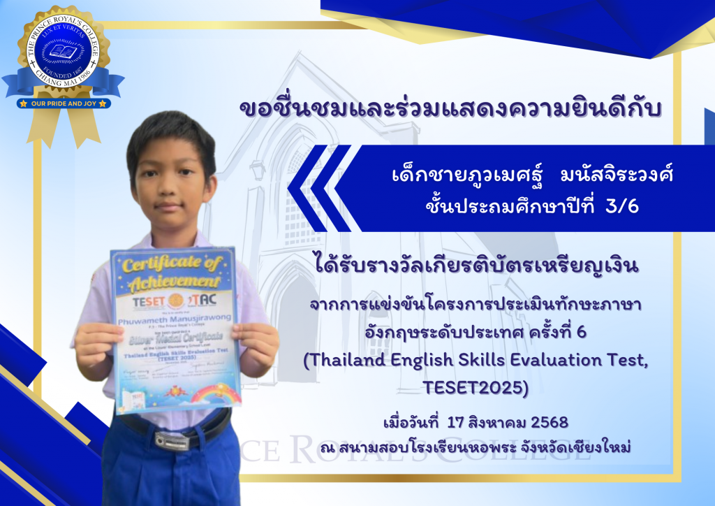 ขอแสดงความชื่นชมและร่วมยินดีกับเด็กชายภูวเมศฐ์ มนัสจิระวงศ์ นักเรียนชั้นประถมศึกษาปีที่ 3/6 ที่ได้รับรางวัลเหรียญเงิน จากการแข่งขันในโครงการประเมินทักษะภาษาอังกฤษระดับประเทศ ครั้งที่ 6 (Thailand English Skills Evaluation Test, TESET2025)