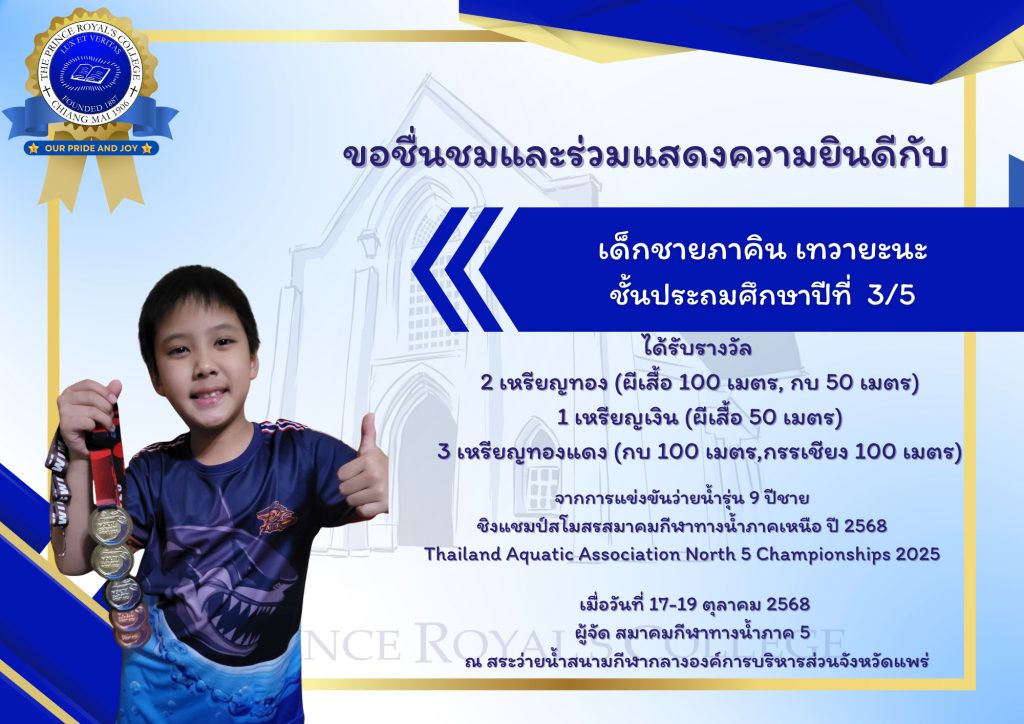 ขอชื่นชมและแสดงความยินดีกับเด็กชายภาคิน เทวายะนะ ชั้นประถมศึกษาปีที่ 3/5 ได้รับรางวัล 2 เหรียญทอง (ผีเสื้อ 100 เมตร, กบ 50 เมตร) 1 เหรียญเงิน (ผีเสื้อ 50 เมตร) 3 เหรียญทองแดง (กบ 100 เมตร,กรรเชียง 100 เมตร) จากการแข่งขัน ว่ายน้ำรุ่น 9 ปีชาย ชิงแชมป์สโมสรสมาคมกีฬาทางน้ำภาคเหนือ ปี 2568 Thailand Aquatic Association North 5 Championships 2025