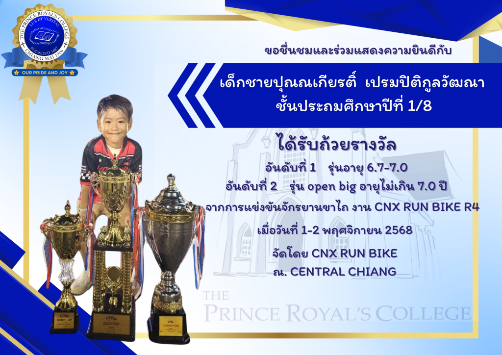 เด็กชายปุณณเกียรติ์ เปรมปิติกูลวัฒณา ชั้นประถมศึกษาปีที่ 1/8 ได้รับถ้วยรางวัล อันดับที่ 1 รุ่นอายุ 6.7-7.0 อันดับที่ 2 รุ่น open big อายุไม่เกิน 7.0 ปี จากการแข่งขันจักรยานขาไถ งาน CNX RUN BIKE R4
