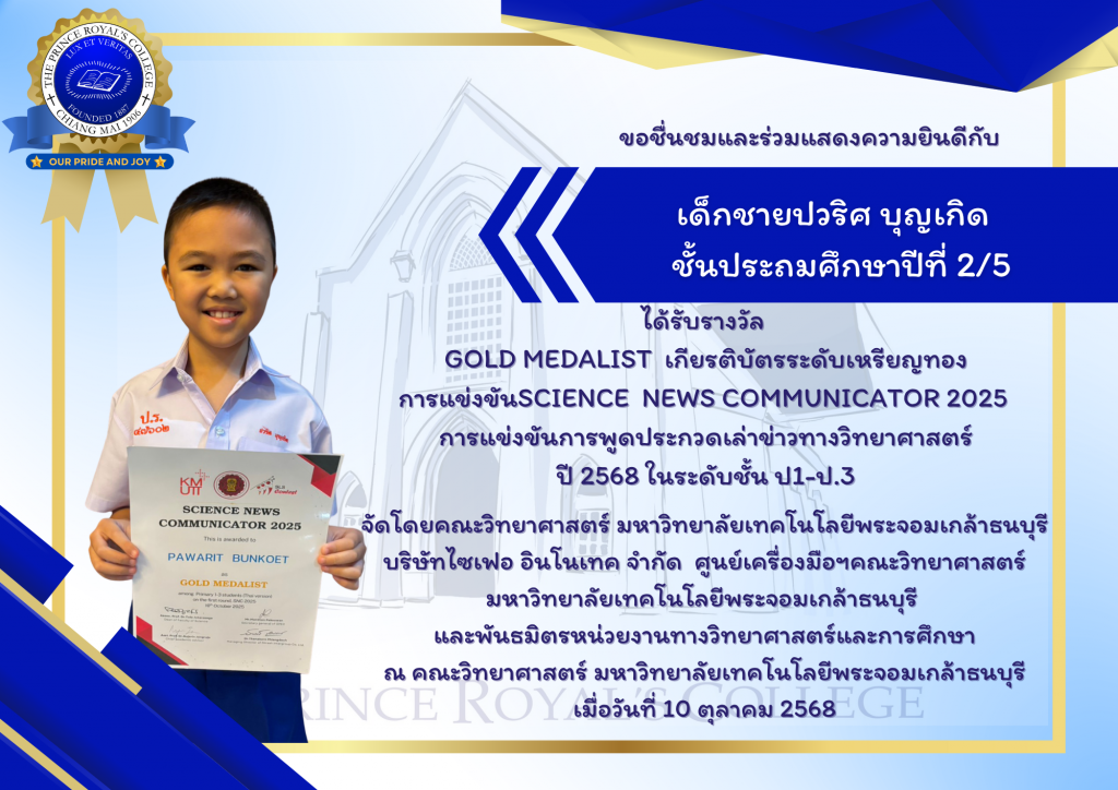 ขอชื่นชมและแสดงความยินดีกับ เด็กชายปวริศ บุญเกิด ชั้นปรัถมศึกษาปีที่ 2/5 ได้รับรางวัล GOLD MEDALIST เกียรติบัตรระดับเหรียญทอง จากรายการแข่งขัน SCIENCE NEWS COMMUNICATOR 2025 (SNC2025) การแข่งขันการพูดประกวดเล่าข่าวทางวิทยาศาสตร์ปี 2568 ในระดับชั้น ป1-ป.3