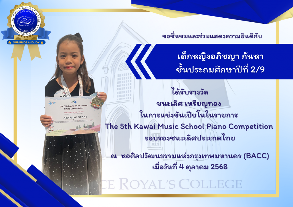 ขอชื่นชมและแสดงความยินดีกับ เด็กหญิงอภิชญา กันหา ชั้นประถมศึกษาปีที่ 2/9 ได้รับรางวัลชนะเลิศ เหรียญทอง จากการแข่งขันเปียโนในรายการ The 5th Kawai Music School Piano Competition รอบรองชนะเลิศประเทศไทย
