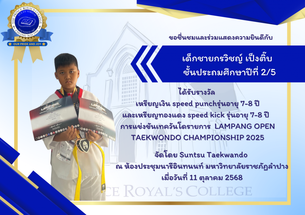 ขอชื่นชมและแสดงความยินดีกับ เด็กชาย.กรวิชญ์ เป็งติ๊บ ชั้นประถมศึกษาปีที่ 2/5 ได้รับรางวัลเหรียญเงิน Speed punch รุ่นอายุ 7 – 8 ปี และ รางวัลเหรียญทองแดง Speed kick รุ่นอายุ 7-8 ปี