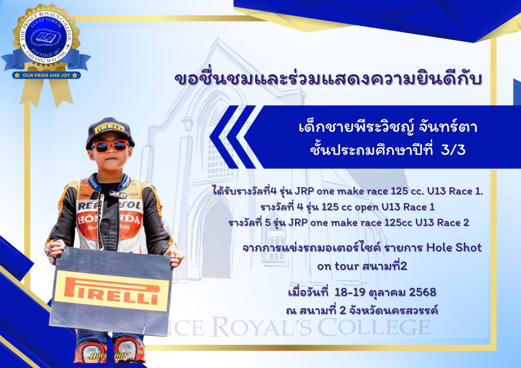ขอชื่นชมและร่วมแสดงความยินดีกับ เด็กชายพีระวิชญ์ จันทร์ตา ชั้นประถมศึกษาปีที่ 3/3 ได้รับรางวัลที่4 รุ่น JRP one make race 125 cc. U13 Race 1. รางวัลที่ 4 รุ่น 125 cc open U13 Race 1 รางวัลที่ 5 รุ่น JRP one make race 125cc U13 Race 2 จากรายการที่ไปแข่งรถมอเตอร์ไซค์ รายการ Hole Shot on tour สนามที่2