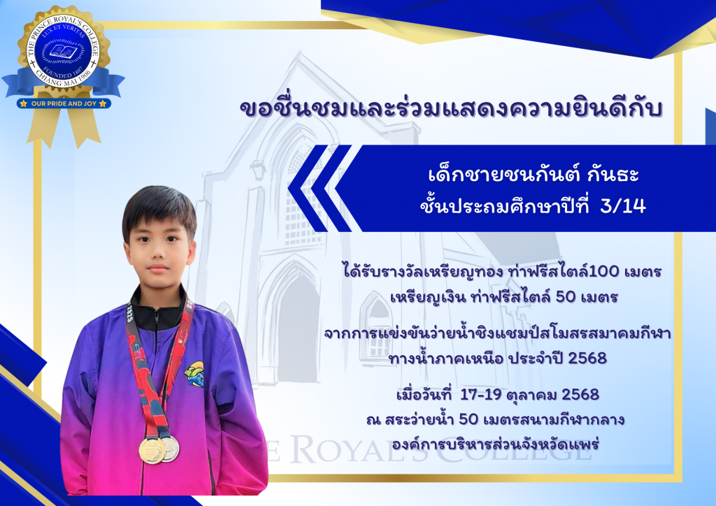 ขอชื่นชมและร่วมแสดงความยินดีกับ เด็กชายชนกันต์ กันธะ ชั้นประถมศึกษาปีที่ 3/14 ได้รับรางวัลหรียญทอง ท่าฟรีสไตล์100 เมตร เหรียญเงิน ท่าฟรีสไตล์ 50 เมตร จากรายการที่ไปแข่งขันว่ายน้ำชิงแชมป์สโมสรสมาคมกีฬาทางน้ำ ภาคเหนือ ประจำปี 2568