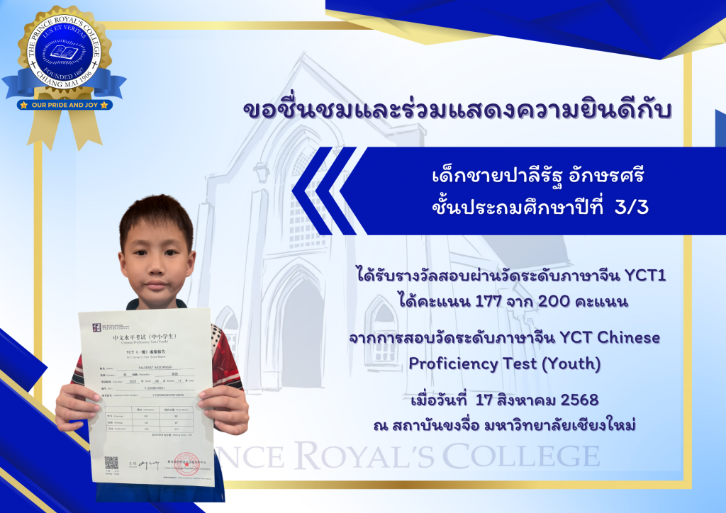 ขอชื่นชมและร่วมแสดงความยินดีกับ เด็กชายปาลีรัฐ อักษรศรี ชั้นประถมศึกษาปีที่ 3/3 ได้รับรางวัลสอบผ่านวัดระดับภาษาจีน YCT1 ได้คะแนน 177 จาก 200 คะแนน จากรายการที่ไปแข่งการสอบวัดระดับภาษาจีน YCT Chinese Proficiency Test (Youth)