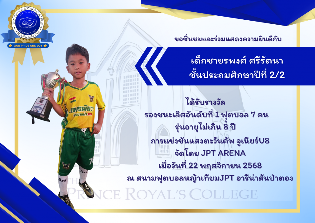 เด็กชายรพงศ์ ศรีรัตนา ชั้นประถมศึกษาปีที่ 2/2 รางวัล รองชนะเลิศอันดับที่ 1 ฟุุตบอล 7 คนรุ่นอายุไม่เกิน 8 ปี การแข่งขันNorth World Cup U9
