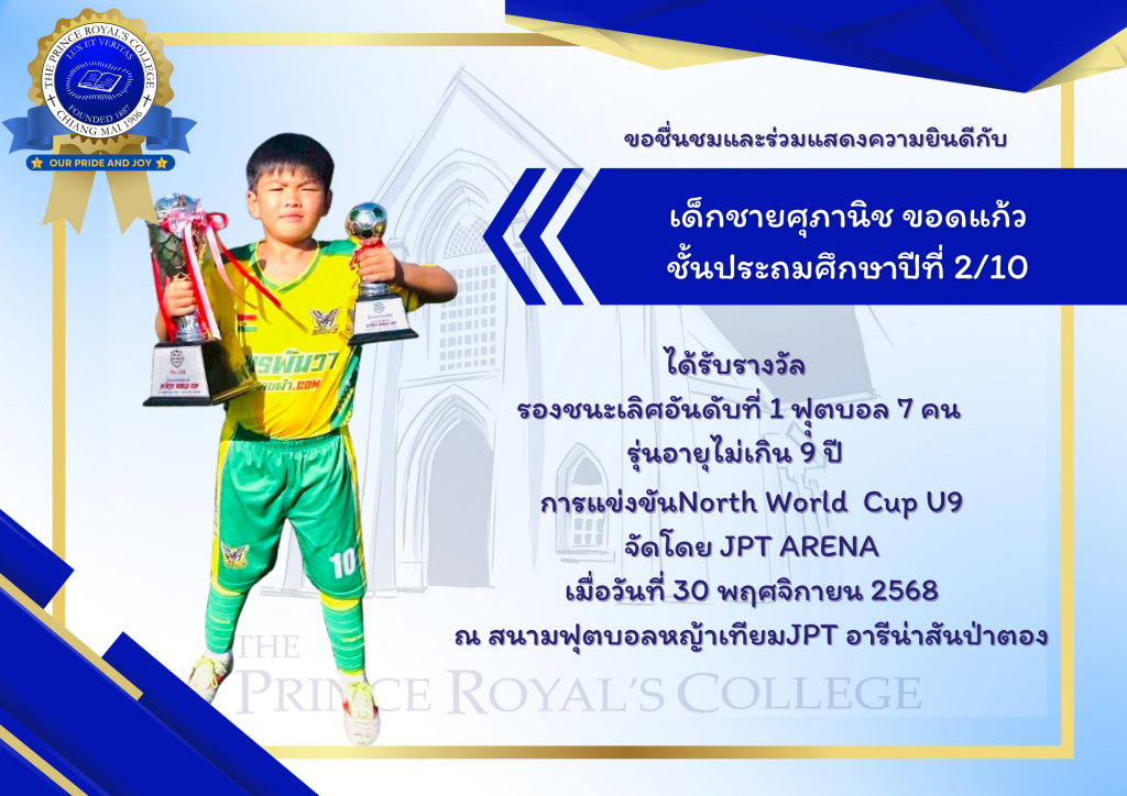 เด็กชายเด็กชายศุภานิช ขอดแก้ว ชั้นประถมศึกษาปีที่ 2/10 รางวัล รองชนะเลิศอันดับที่ 1 ฟุุตบอล 7 คน รุ่นอายุไม่เกิน 9 ปี การแข่งขันNorth World Cup U9