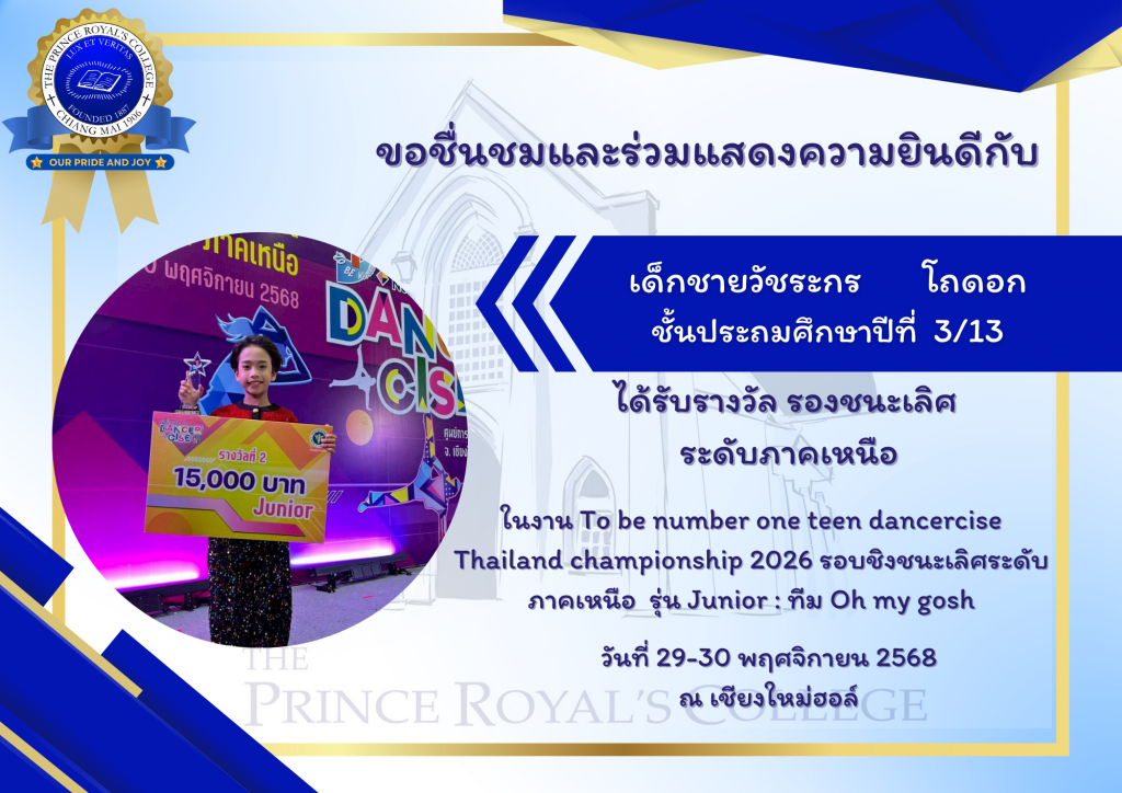 ขอแสดงความชื่นชมและร่วมยินดีกับเด็กชายวัชระกร โถดอก ชั้นประถมศึกษาปีที่ 3/13 ได้รับรางวัล รองชนะเลิศ ระดับภาคเหนือ ในงาน To be number one teen dancercise Thailand championship 2026 รอบชิงชนะเลิศระดับภาคเหนือ รุ่น Junior : ทีม Oh my gosh