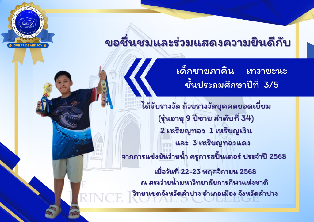 ขอแสดงความชื่นชมและร่วมยินดีกับเด็กชายภาคิน เทวายะนะ ชั้นประถมศึกษาปีที่ 3/5 ได้รับรางวัล ถ้วยรางวัลบุคคลยอดเยี่ยมรุ่นอายุ 9 ปีชาย ลำดับที่ 34
