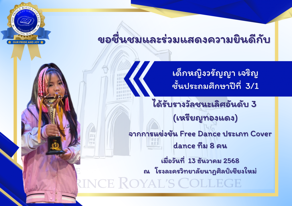 ขอชื่นชมและร่วมแสดงความยินดีกับ เด็กหญิงวรัญญา เจริญ ชั้นประถมศึกษาปีที่ 3/1 ได้รับรางวัล ชนะเลิศอันดับ 3 (เหรียญทองแดง) จากรายการที่ไปแข่ง Free Dance ประเภท Cover dance ทีม 8 คน