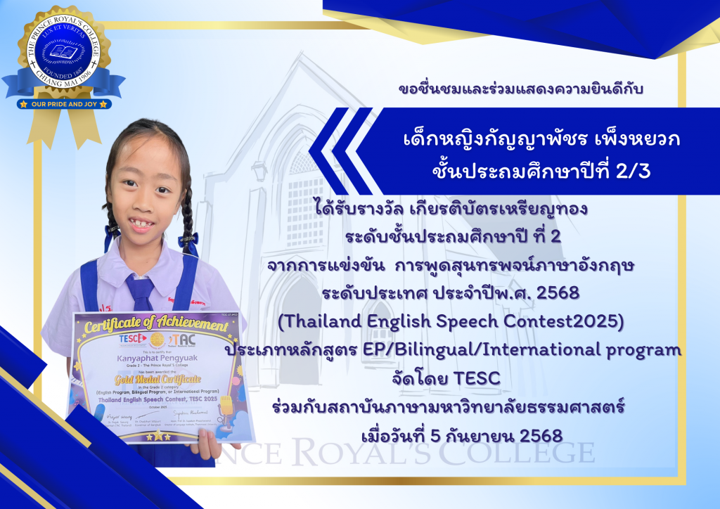 เด็กหญิงกัญญาพัชร เพ็งหยวก ชั้นประถมศึกษาปีที่ 2/3 รางวัล เกียรติบัตรเหรียญทอง ระดับชั้นประถมศึกษาปี ที่ 2 การแข่งขัน การพูดสุนทรพจน์ภาษาอังกฤษ ระดับประเทศ ประจำปีพ.ศ. 2568