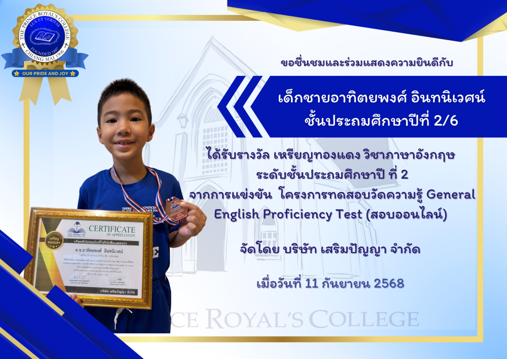 เด็กชายอาทิตยพงศ์ อินทนิเวศน์ ชั้นประถมศึกษาปีที่ 2/6 รางวัล เหรียญทองแดง วิชาภาษาอังกฤษ ระดับชั้นประถมศึกษาปี ที่ 2 การแข่งขัน โครงการทดสอบวัดความรู้ General English Proficiency Test
