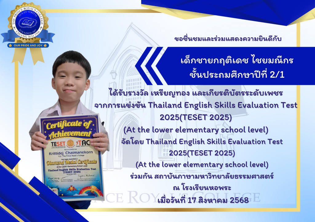 เด็กชายกฤติเดช ไชยมณีกร ชั้นประถมศึกษาปีที่ 2/1 รางวัล เหรียญทอง และเกียรติบัตรระดับเพชร การแข่งขัน Thailand English Skills Evaluation Test 2025