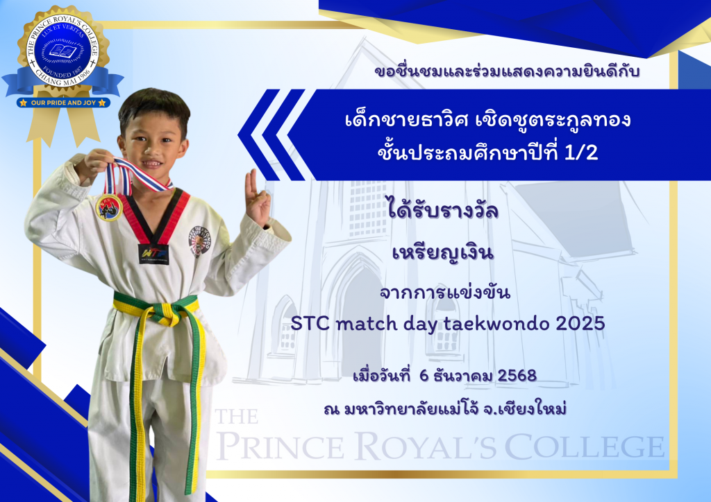 เด็กชายธาวิศ เชิดชูตระกูลทอง ชั้นประถมศึกษาปีที่ 1/2 ได้รับรางวัลเหรียญเงิน จากการแข่งขัน STC match day taekwondo2025
