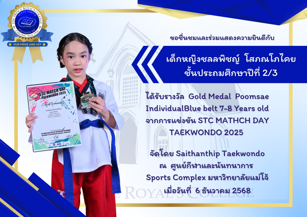 ขอชื่นชมและแสดงความยินดีกับ เด็กหญิงชลลพิชญ์ โสภณโภไคย ชั้นประถมศึกษาปีที่ 2/3 ได้รับรางวัล Gold Medal Poomsae IndividualBlue belt 7-8 Years old จากการแข่งขัน STC MATHCH DAY TAEKWONDO 2025