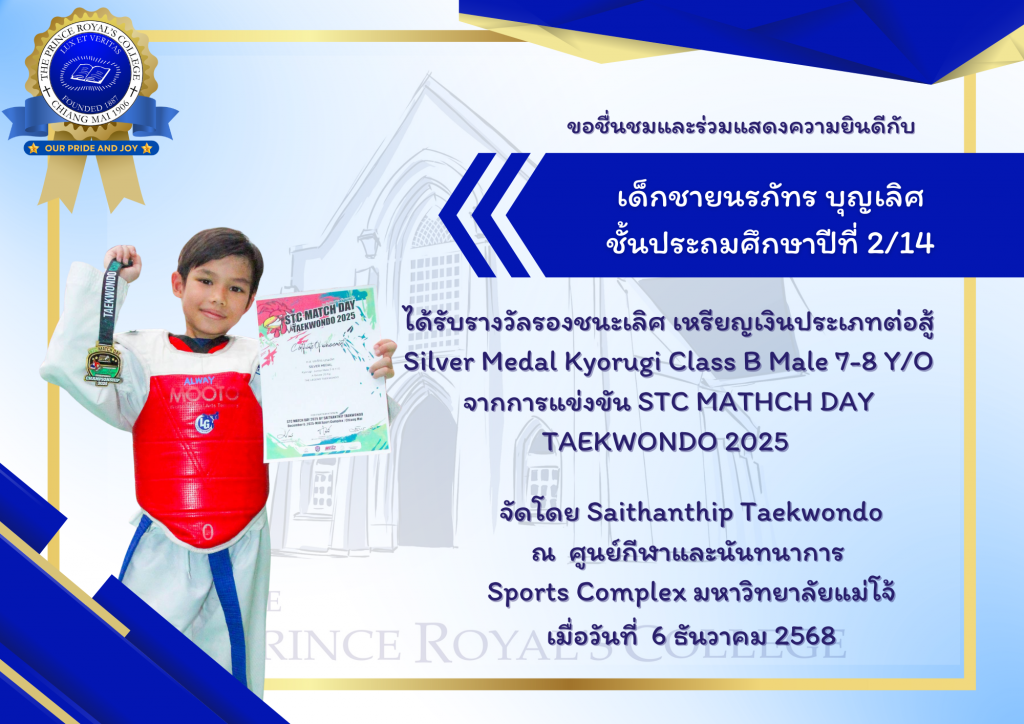 ขอชื่นชมและแสดงความยินดีกับ เด็กชายนรภัทร บุญเลิศ ชั้นประถมศึกษาปีที่ 2/14 ได้รับรางวัลรองชนะเลิศ เหรียญเงินประเภทต่อสู้ Silver Medal Kyorugi Class B Male 7-8 Y/O จากการแข่งขัน STC MATHCH DAY TAEKWONDO 2025