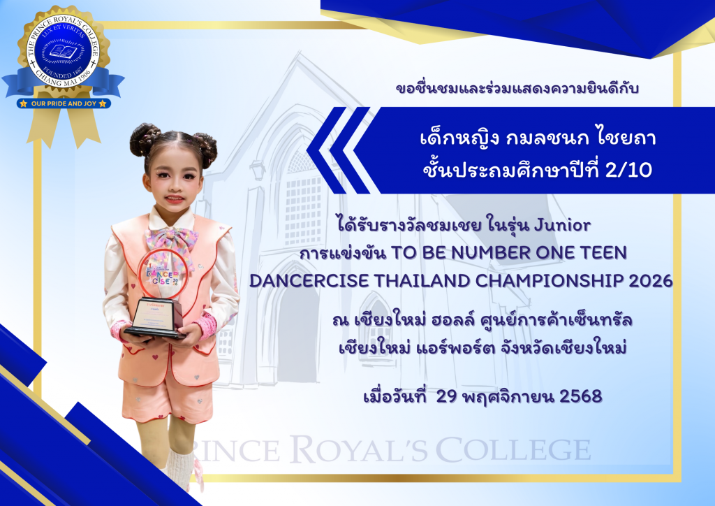 ขอชื่นชมและแสดงความยินดีกับ เด็กหญิงกมลชนก ไชยถา ชั้นประถมศึกษาปีที่ 2/10 ได้รับรางวัลชมเชย ในรุ่น Junior จากการแข่งขัน TO BE NUMBER ONE TEEN DANCERCISE THAILAND CHAMPIONSHIP 2026 รอบคัดเลือก ระดับภาคเหนือ