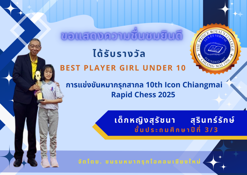 เด็กหญิงสุรัชนา สุรินทร์รักษ์ นักเรียนชั้นประถมศึกษาปีที่ 3/3 รางวัล Best player girl under 10 การแข่งขันหมากรุกสากล 10th Icon Chiangmai Rapid Chess 2025