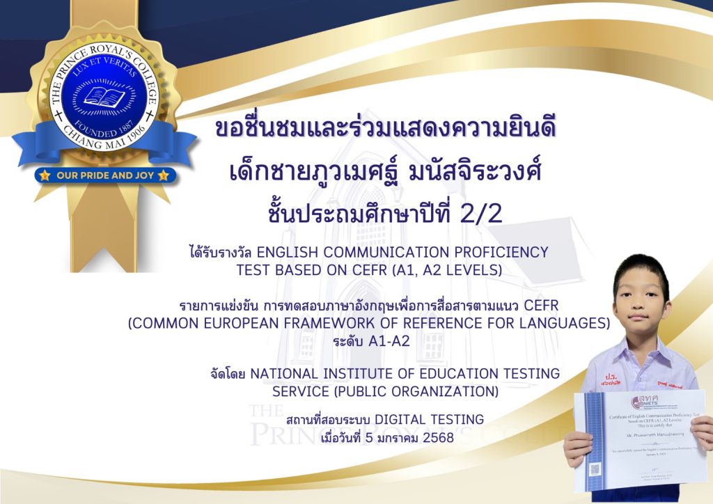 เด็กชายภูวเมศฐ์ มนัสจิระวงศ์ ชั้นประถมศึกษาปีที่ 2/2 ได้รับรางวัล English Communication Proficiency Test based on CEFR (A1, A2 levels) รายการทดสอบภาษาอังกฤษเพื่อการสื่อสารตามแนว CEFR (Common European Framework of Reference for Languages) ระดับ A1-A2 ระดับปฐมศึกษาตอนปลาย-มัธยมศึกษาตอนปลาย หรือเทียบเท่า