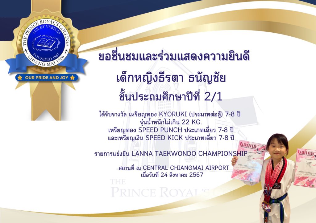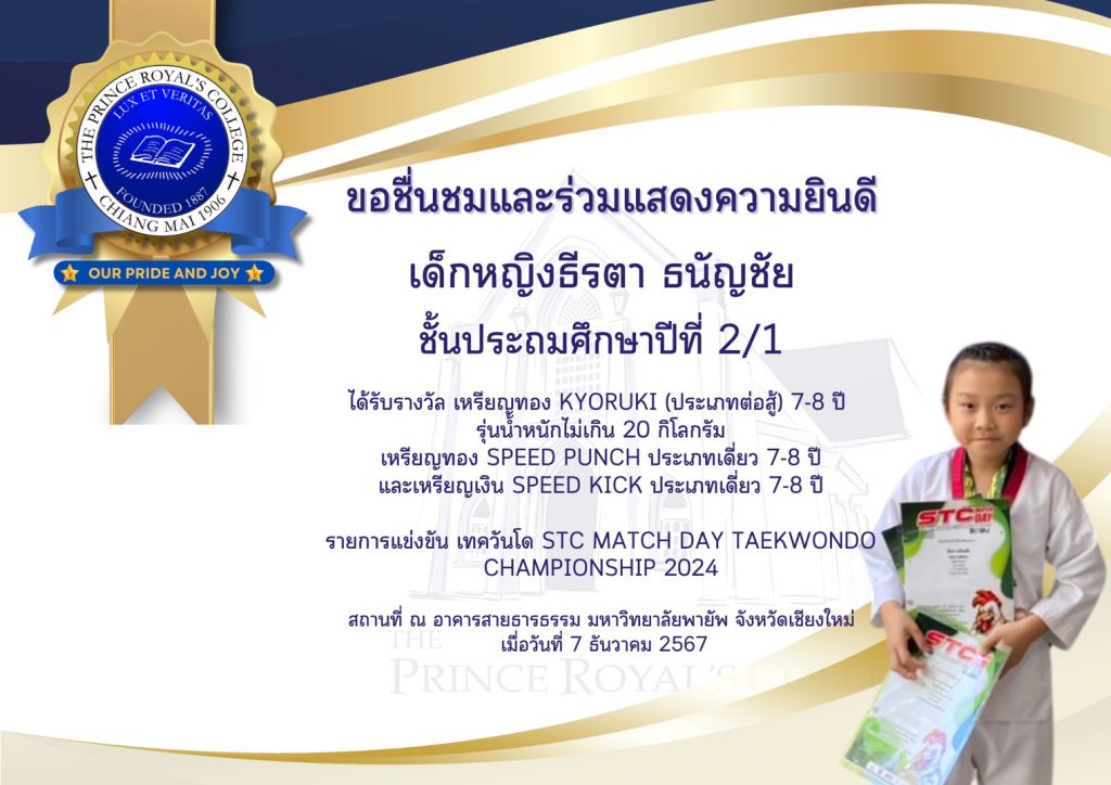 เด็กหญิงธีรตา ธนัญชัย ได้รับ 2 เหรียญ และ 1 เหรียญเงิน ในการแข่งขันเทควันโด STC MATCH DAY TAEKWONDO CHAMPIONSHIP 2024