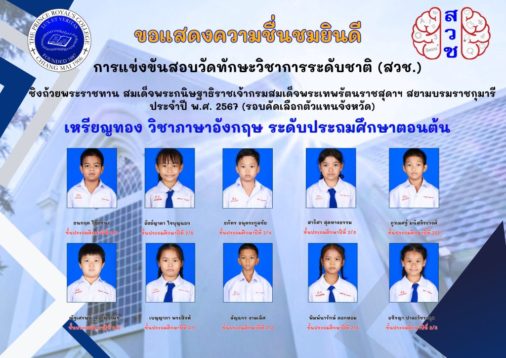 นักเรียนชั้นประถมศึกษาปีที่ 1-3 ที่ได้รับรางวัลจากการสอบวัดทักษะวิชาการระดับชาติ (สวช.) ประจำปี พ.ศ. 2567 (รอบคัดเลือกตัวแทนจังหวัด) วิชาภาษาอังกฤษ