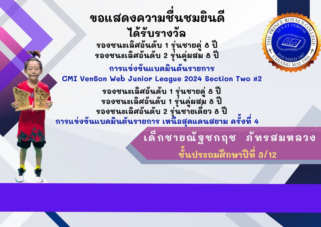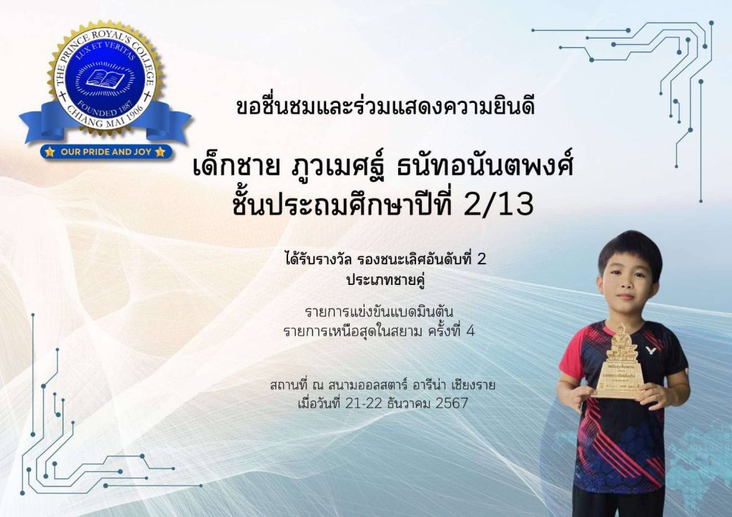 เด็กชายภูวเมศฐ์ ธนัทอนันตพงศ์ ชั้นประถมศึกษาปีที่ 2/13 ได้รับรางวัล รองชนะเลิศอันดับ 2 ประเภทชายคู่ 8ปี รายการแข่งขันแบดมินตัน รายการเหนือสุดในสยาม ครั้งที่ 4