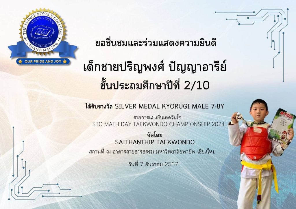 เด็กชายปริญพงศ์ ปัญญาอารีย์ ชั้นประถมศึกษาปีที่ 2/10 ได้รับรางวัล SILVER MEDAL Kyorugi Male 7-8Y จากรายการแข่งขันเทควันโด STC MATH DAY TAEKWONDO CHAMPIONSHIP 2024