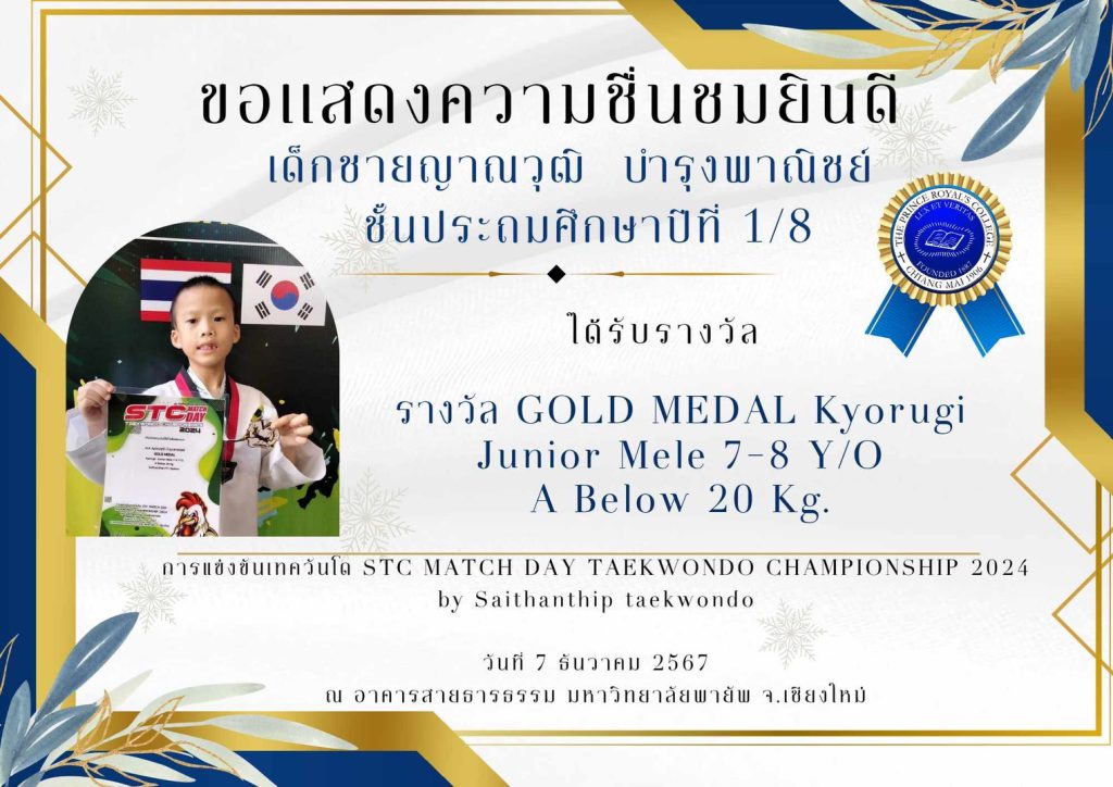 เด็กชายญาณวุฒิ บำรุงพาณิชย์ ชั้น ป.1/8 รางวัล GOLD MEDAL Kyorugi : Junior Mele 7-8 Y/O A Below 20 Kg.