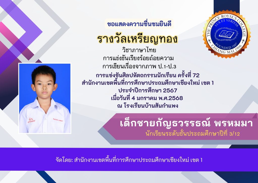 เด็กชายกัญธวรรธณ์ พรหมมา นักเรียนชั้นประถมศึกษาปีที่ 3/12 ที่ได้รับรางวัลเหรียญทอง จากการแข่งขันวิชาภาษาไทย การแข่งขันเรียงร้อยถ้อยความ การเขียนเรื่องจากภาพ ป.1-ป.3 เนื่องในการแข่งขันศิลปหัตถกรรมนักเรียนครั้งที่ 72 สำนักงานเขตพื้นที่การศึกษาประถมศึกษาเชียงใหม่ เขต 1 ประจำปีการศึกษา 2567
