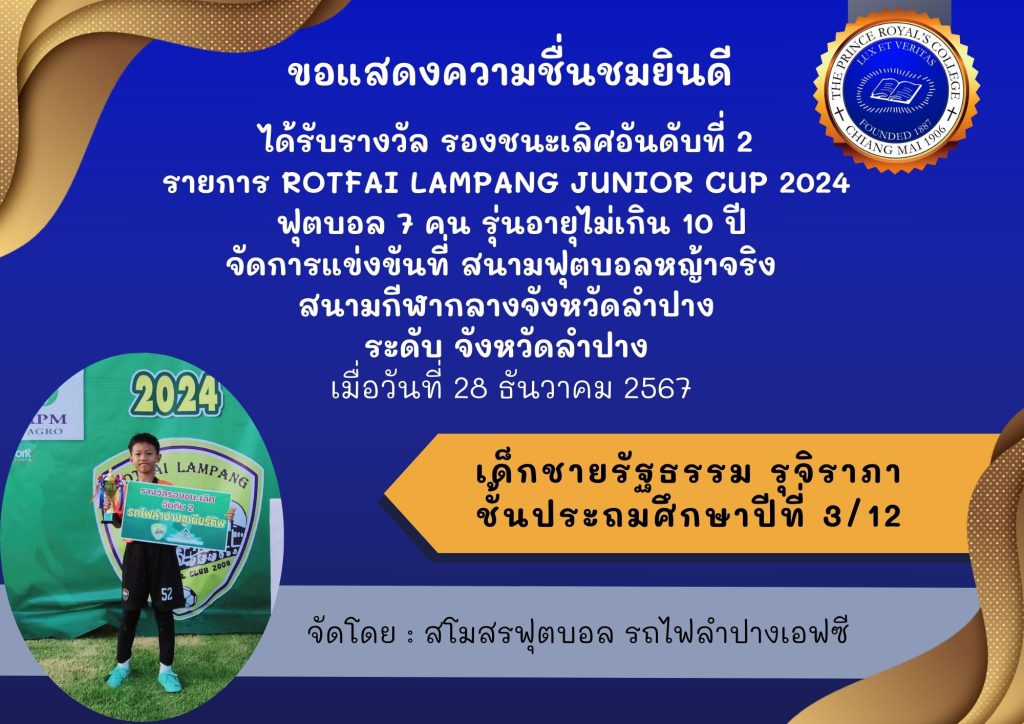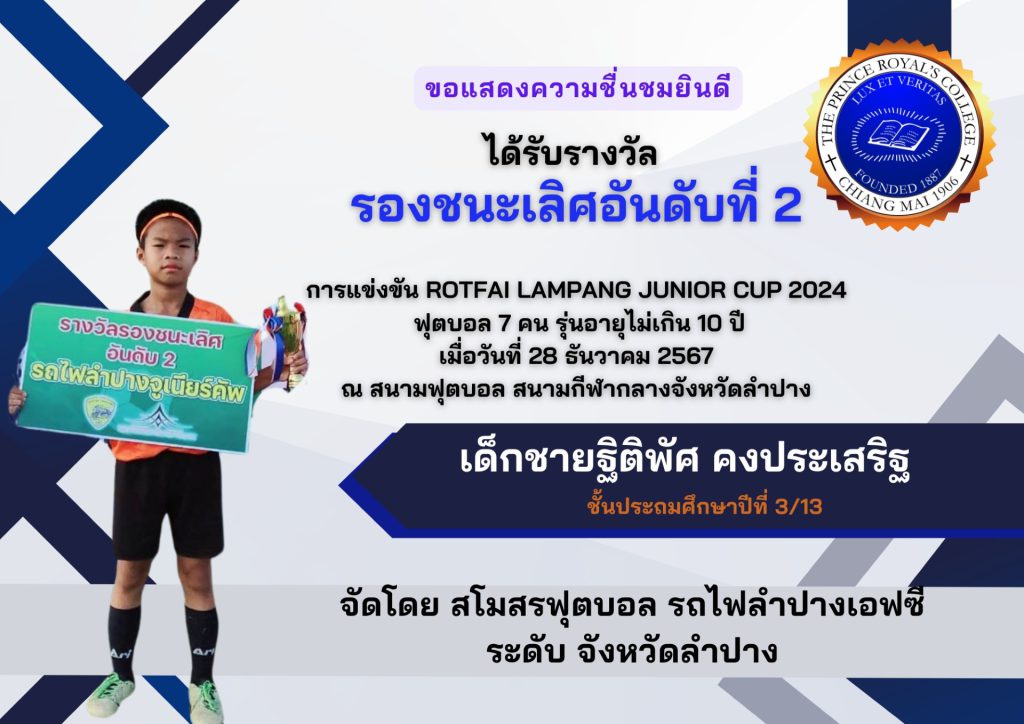 เด็กชายฐิติพัศ คงประเสริฐ นักเรียนชั้นประถมศึกษาปีที่ 3/13 ได้รับรางวัลรองชนะเลิศอันดับที่ 2 จากการแข่งขันฟุตบอล รายการ Rotfai Lampang Junior Cup 2024