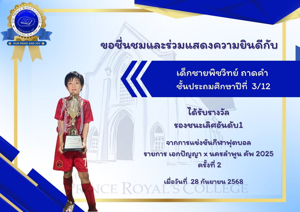 ขอชื่นชมและร่วมแสดงความยินดีกับเด็กชายพิชวิทย์ ถาดคำ นักเรียนชั้นประถมศึกษาปีที่ 3/12 ได้รับรางวัล รองชนะเลิศอันดับ1 จากการแข่งขันกีฬาฟุตบอล รายการ เอกปัญญา x นครลำพูน คัพ 2025 ครั้งที่ 2
