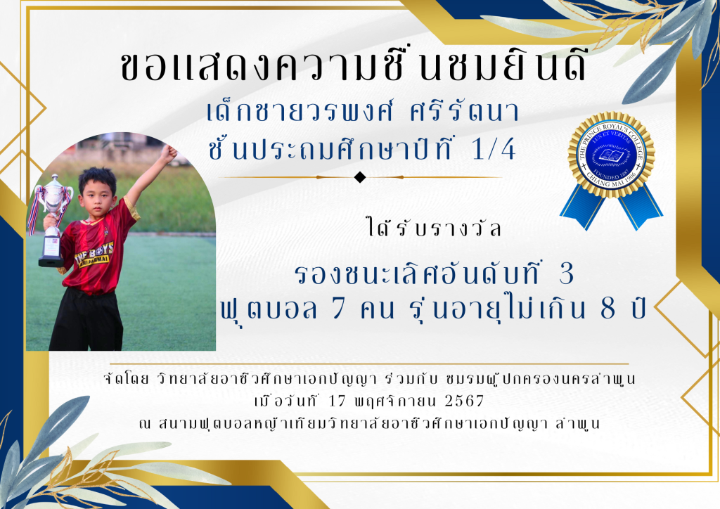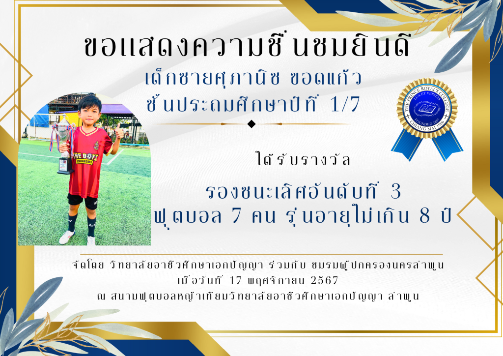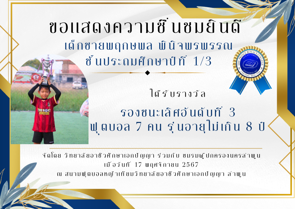 เด็กชายพฤกษพล พินิจพรพรรณ ชั้นประถมศึกษาปีที่ 1/3 ได้รับรางวัล รองชนะเลิศอันดับที่ 3 ฟุุตบอล 7 คน รุ่นอายุไม่เกิน 8 ปี จัดโดย วิทยาลัยอาชีวศึกษาเอกปัญญา ร่วมกับ ชมรมผู้ปกครองนครลำพูน
