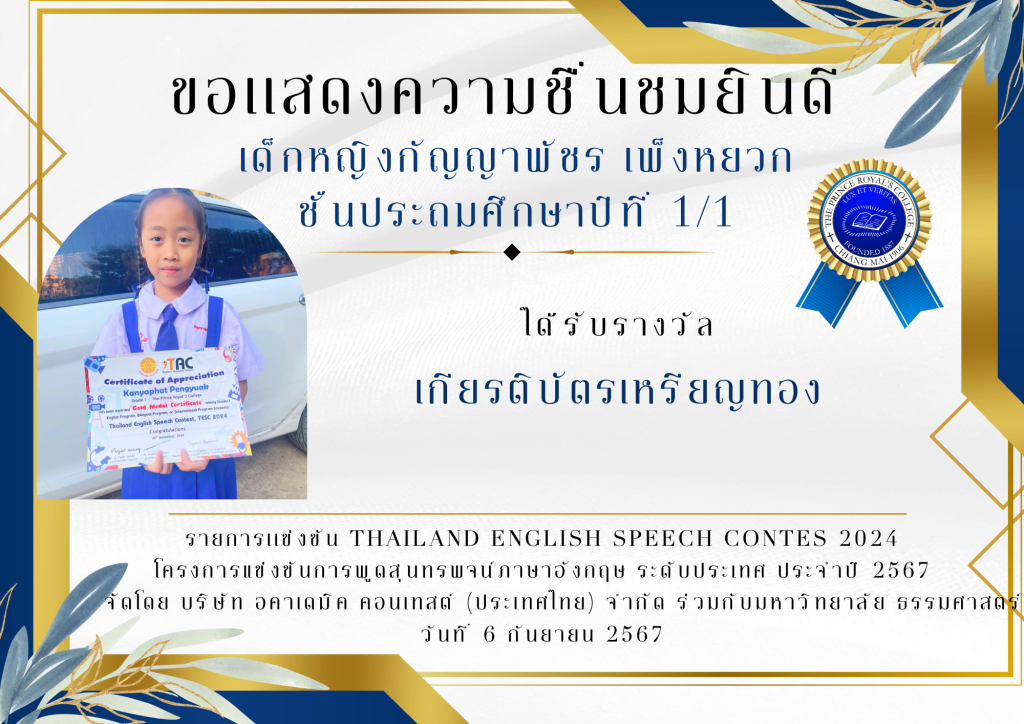 เด็กหญิงกัญญาพัชร เพ็งหยวก ชั้นประถมศึกษาปีที่ 1/1 ได้รับรางวัล เกียรติบัตรเหรียญทอง รายการเเข่งขัน THAILAND ENGLISH SPEECH CONTES 2024 โครงการแข่งขันการพูดสุนทรพจน์ภาษาอังกฤษ ระดับประเทศ ประจำปี 2567