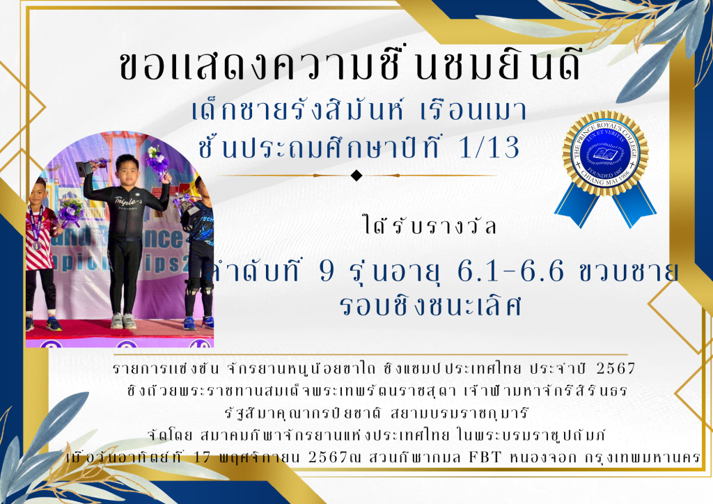 เด็กชายรังสิมันห์ เรือนเมา ชั้นประถมศึกษาปีที่ 1/13 ได้รับรางวัล ลำดับที่ 9 รุ่นอายุ 6.1-6.6 ขวบชายรอบชิงชนะเลิศ รายการเเข่งขัน จักรยานหนูน้อยขาไถ ชิงแชมป์ประเทศไทย ประจำปี 2567 ชิงถ้วยพระราชทานสมเด็จพระเทพรัตนราชสุดาฯ