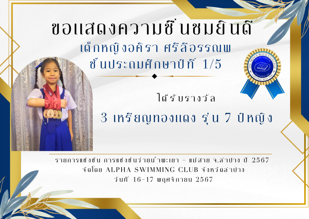 เด็กหญิงอคิรา ศรีลีอรรณพ ชั้นประถมศึกษาปีที่ 1/5 ได้รับรางวัล 3 เหรียญทองเเดง รุ่น 7 ปีหญิง การแข่งขันว่ายน้ำพะเยา – แม่สาย จ.ลำปาง ปี 2567จัดโดย ALPHA SWIMMING CLUB