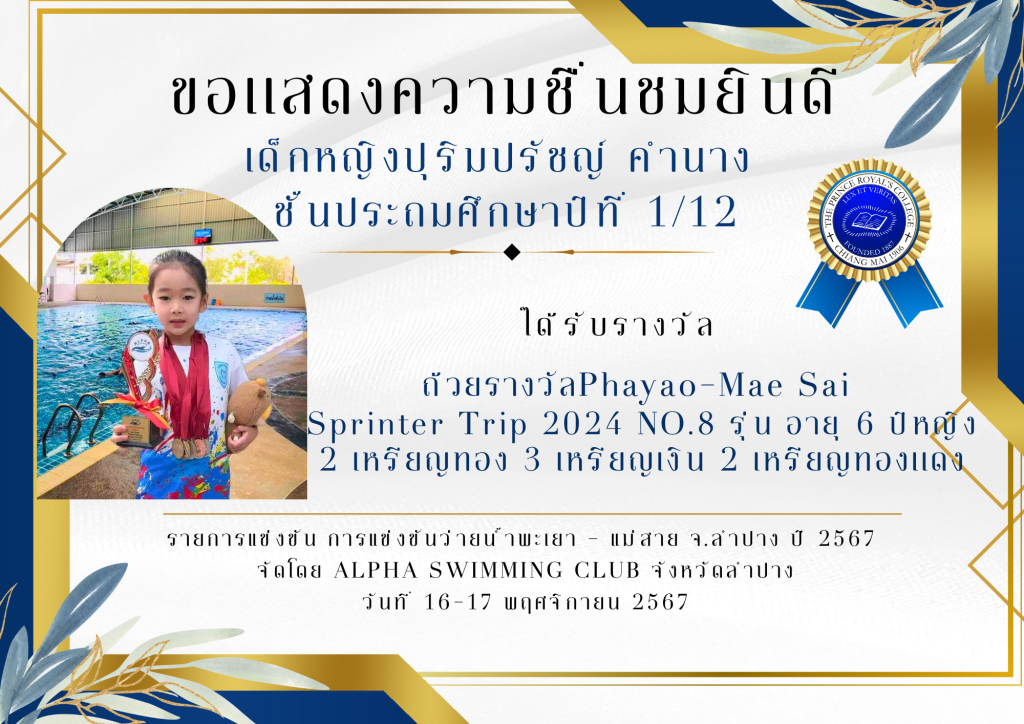 เด็กหญิงปุริมปรัชญ์ คำนาง ชั้นประถมศึกษาปีที่ 1/12 ได้รับ ถ้วยรางวัลPhayao-Mae Sai Sprinter Trip 2024 NO.8 รุ่น อายุ 6 ปีหญิง รายการแข่งขัน การแข่งขันว่ายน้ำพะเยา – แม่สาย จ.ลำปาง ปี 2567