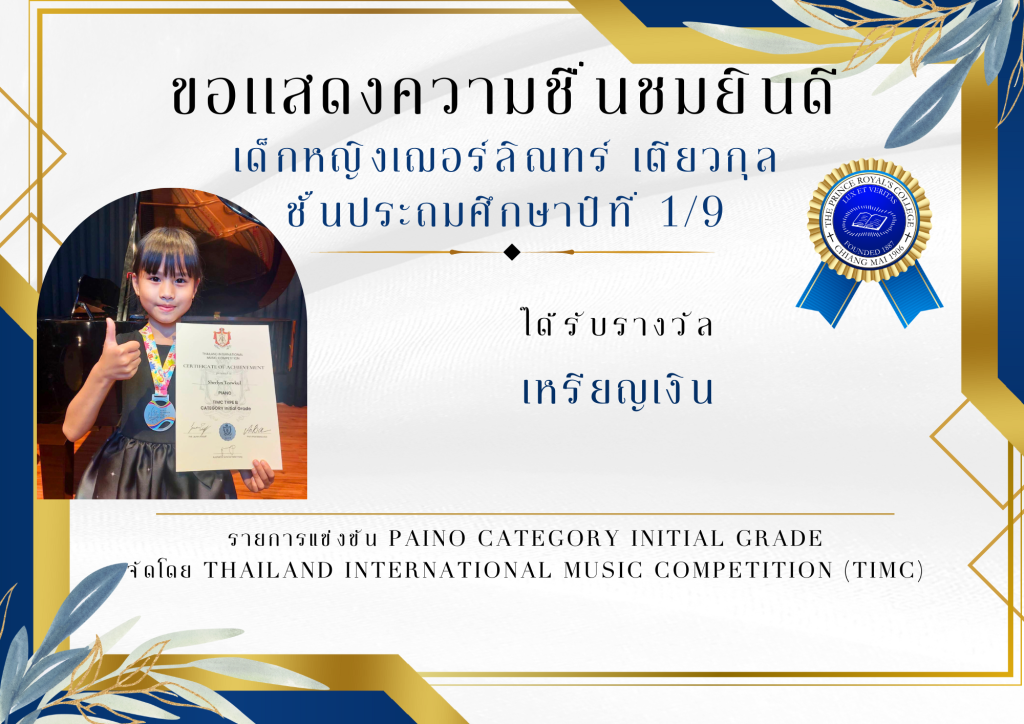 เด็กหญิงเฌอร์ลิณทร์ เตียวกุล ชั้นประถมศึกษาปีที่ 1/9 ได้รับรางวัลเหรียญเงิน จากรายการแข่งขัน PAINO CATEGORY INITIAL GRADE