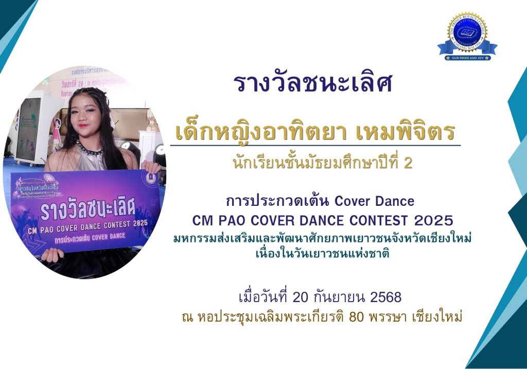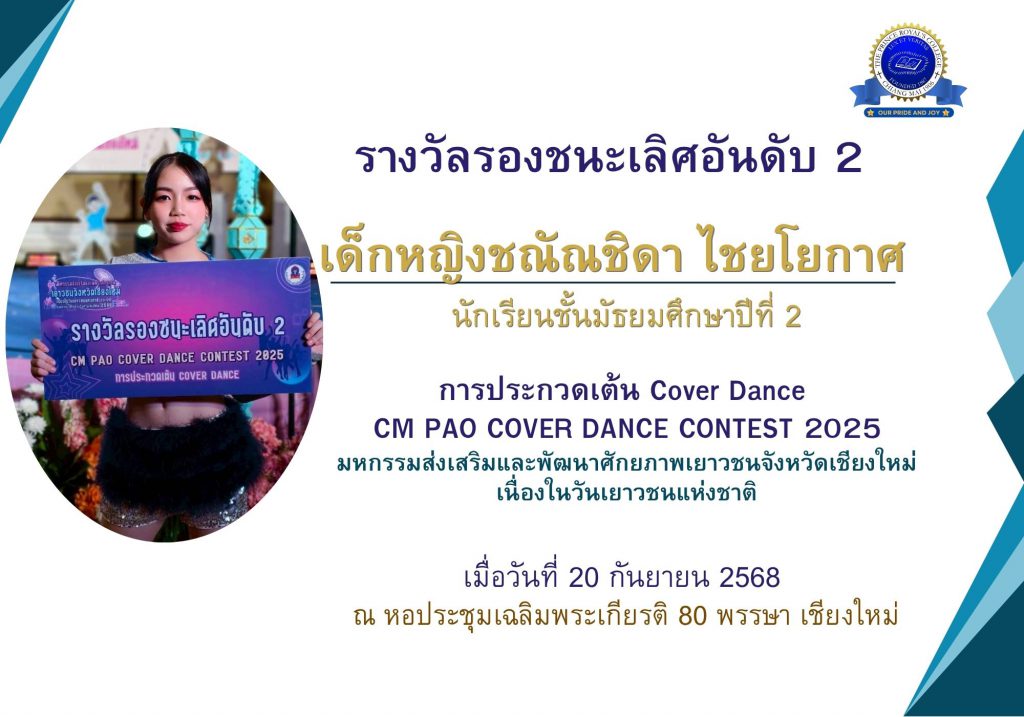 เด็กหญิงชณัณชิดา ไชยโยกาศ รางวัลรองชนะเลิศอันดับ 2 การประกวดเต้น Cover Dance CM PAO COVER DANCE CONTEST 2025 มหกรรมส่งเสริมและพัฒนาศักยภาพเยาวชนจังหวัดเชียงใหม่เนื่องในวันเยาวชนแห่งชาติประจำปี 2568