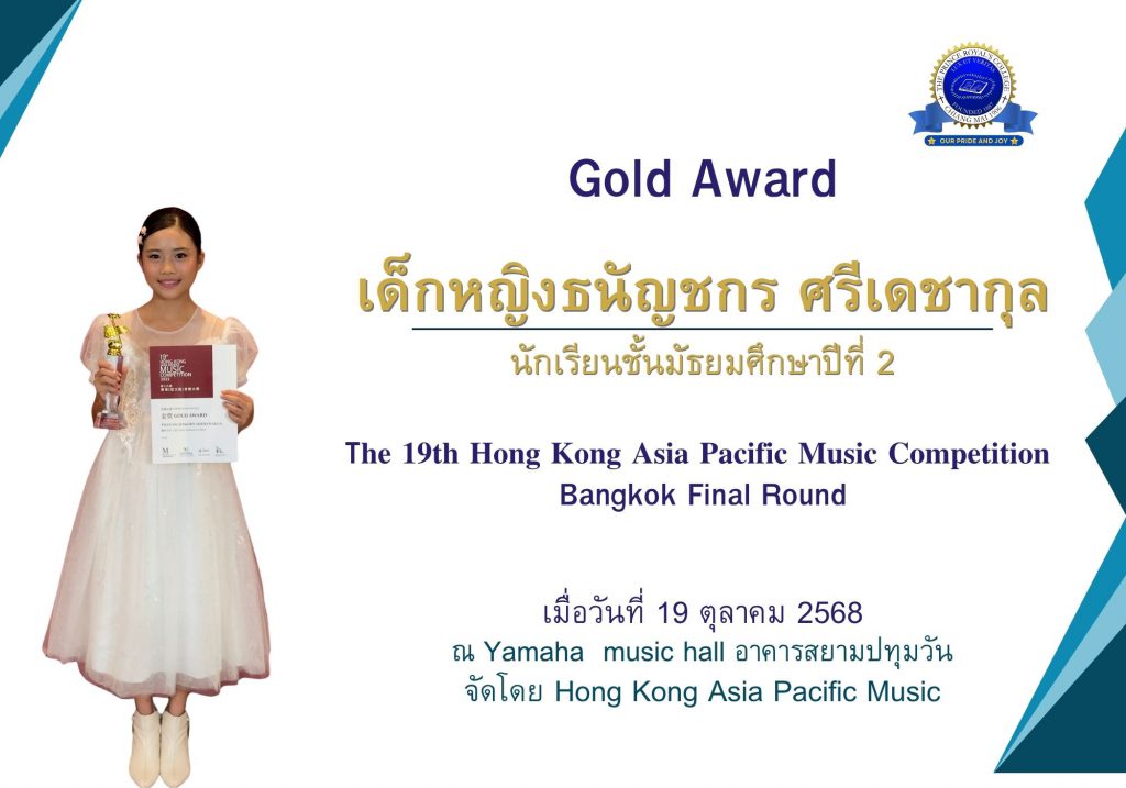 เด็กหญิงธนัญชกร ศรีเดชากุล รางวัล Gold Award การแข่งขัน 𝐓𝐡𝐞 𝟏𝟗𝐭𝐡 𝐇𝐨𝐧𝐠 𝐊𝐨𝐧𝐠 𝐀𝐬𝐢𝐚 𝐏𝐚𝐜𝐢𝐟𝐢𝐜 𝐌𝐮𝐬𝐢𝐜 𝐂𝐨𝐦𝐩𝐞𝐭𝐢𝐭𝐢𝐨𝐧