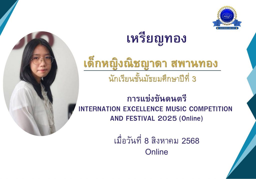 เด็กหญิงณิชญาดา สพานทอง เหรียญทอง การแข่งขันดนตรีรายการ INTERNATION EXCELLENCE MUSIC COMPETITION AND FESTIVAL 2025