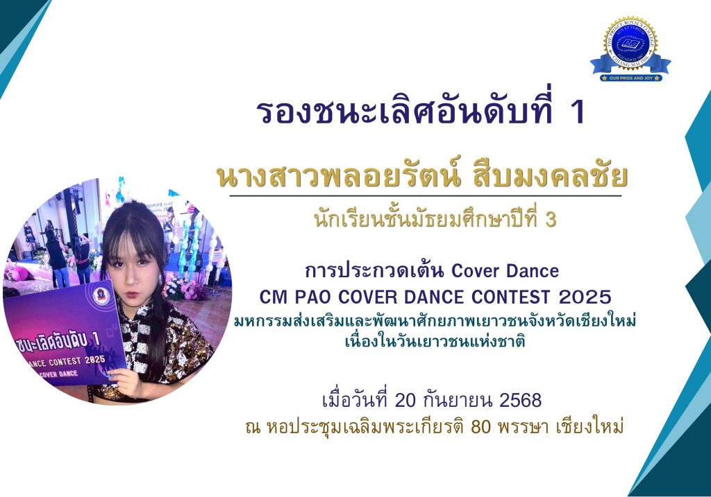 นางสาวพลอยรัตน์ สืบมงคลชัย รางวัลรองชนะเลิศอันดับที่ 1 การประกวดเต้น Cover Dance CM PAO COVER DANCE CONTEST 2025 มหกรรมส่งเสริมและพัฒนาศักยภาพเยาวชนจังหวัดเชียงใหม่เนื่องในวันเยาวชนแห่งชาติประจำปี 2568