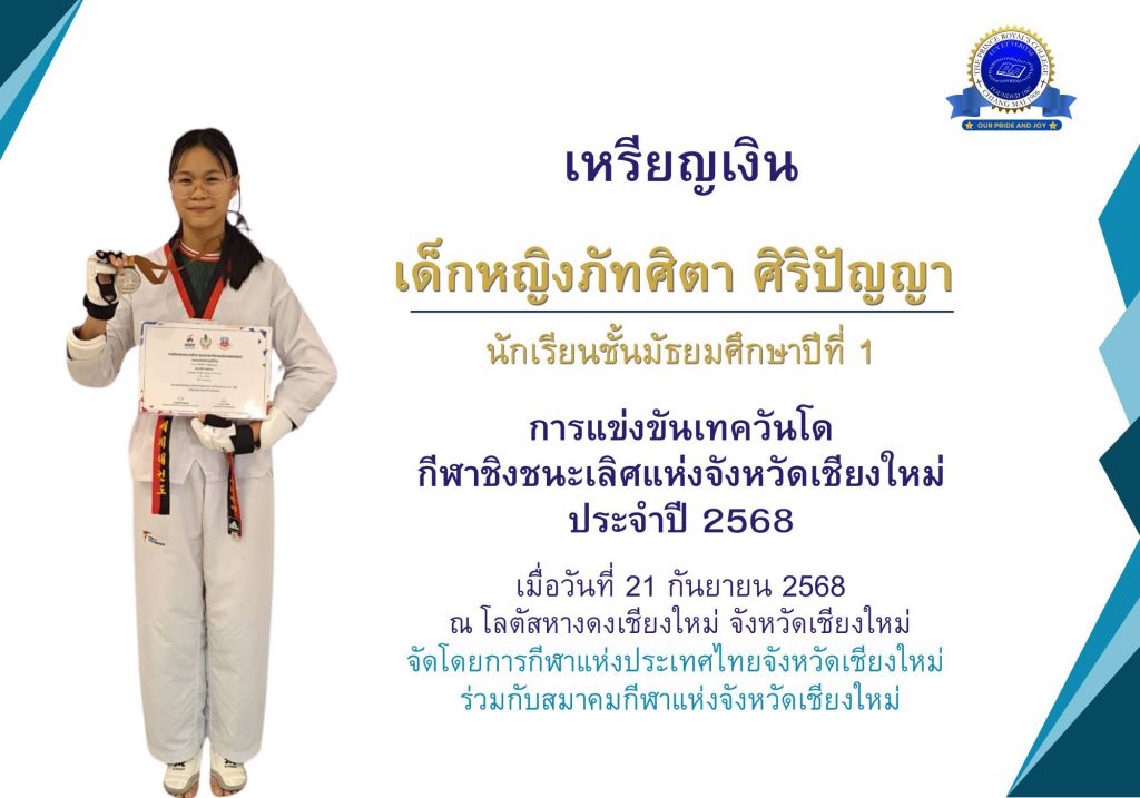 เด็กหญิงภัทศิตา ศิริปัญญา เหรียญเงิน กีฬาเทควันโด การแข่งขันกีฬาชิงชนะเลิศแห่งจังหวัดเชียงใหม่ ประจำปี 2568