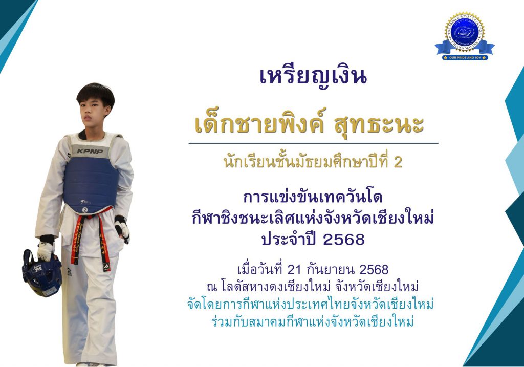 เด็กชายพิงค์ สุทธะนะ เหรียญเงิน กีฬาเทควันโด การแข่งขันกีฬาชิงชนะเลิศแห่งจังหวัดเชียงใหม่ ประจำปี 2568