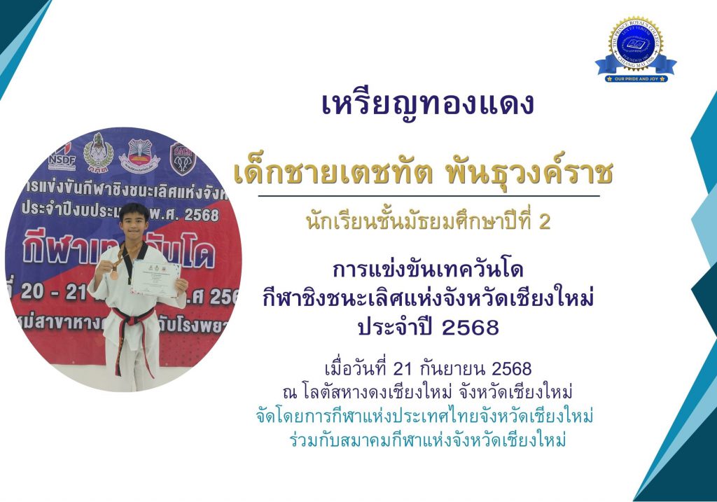 เด็กชายเตชทัต พันธุวงค์ราช เหรียญทองแดง กีฬาเทควันโด การแข่งขันกีฬาชิงชนะเลิศแห่งจังหวัดเชียงใหม่ ประจำปี 2568