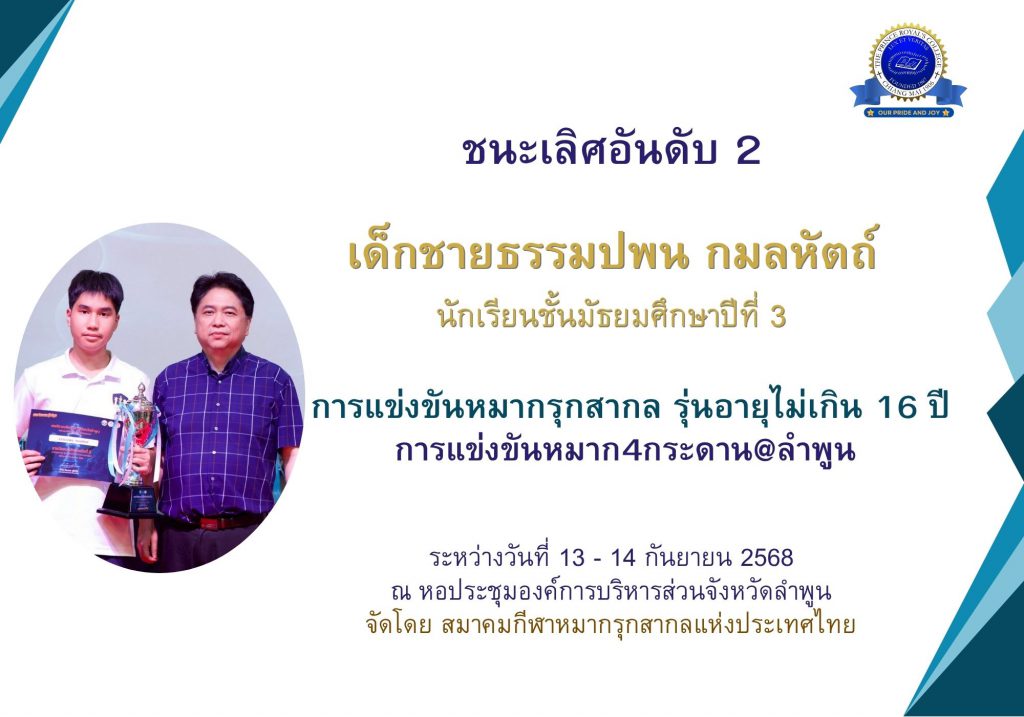 เด็กชายธรรมปพน กมลหัตถ์ รางวัลชนะเลิศอันดับ 2 กีฬาหมากรุกสากล การแข่งขัน หมาก4กระดาน@ลำพูน