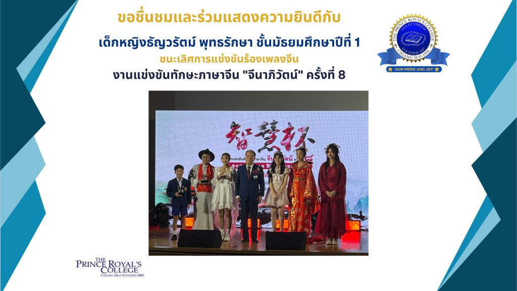 รางวัลชนะเลิศระดับประเทศการแข่งขันร้องเพลงจีนนักเรียนมัธยมศึกษาตอนต้น งานแข่งขันทักษะภาษาจีน “จีนาภิวัตน์”ครั้งที่ 8