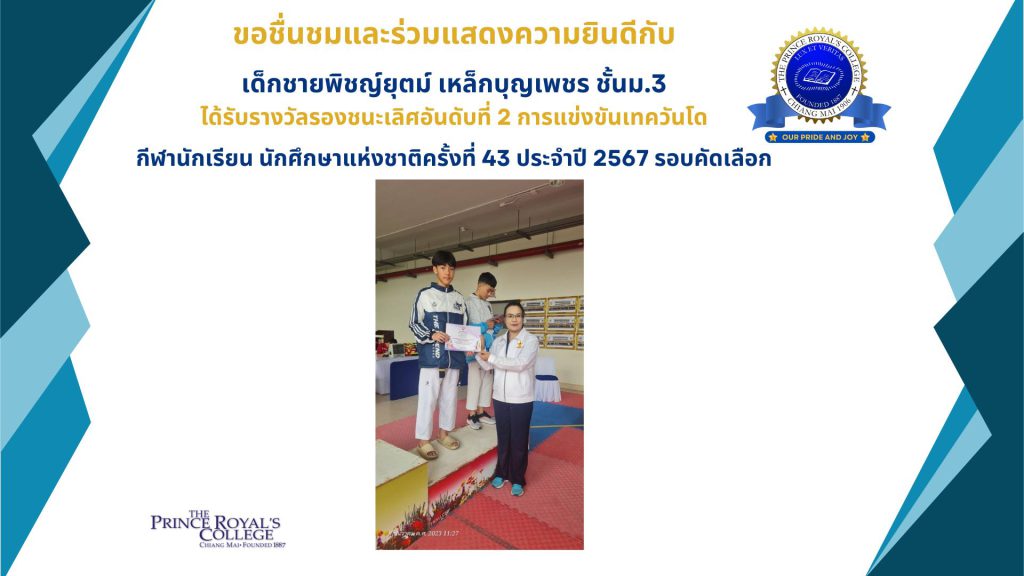 รางวัลชนะเลิศ การแข่งขันเทควันโด การแข่งขันกีฬานักเรียนนักศึกษาแห่งชาติครั้งที่ 43 ประจำปี 2567 รอบคัดเลือก